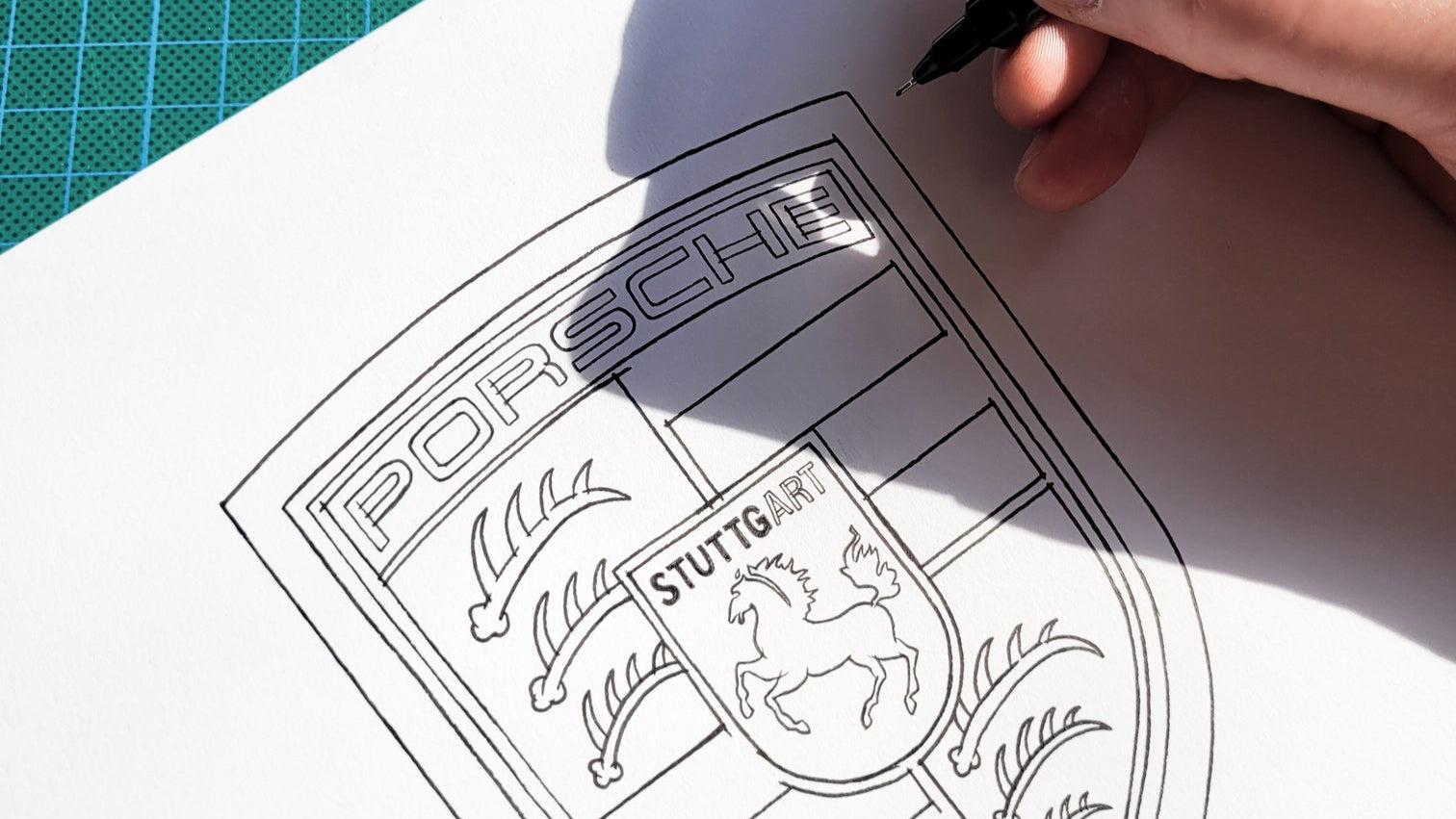 À l’intérieur, croquis de recherche du logo Porsche, affiches de pubs et slogans, records historiques, autant d’éléments qui entoure une Porsche 911 miniature faite elle aussi uniquement d’encre et de papier.
