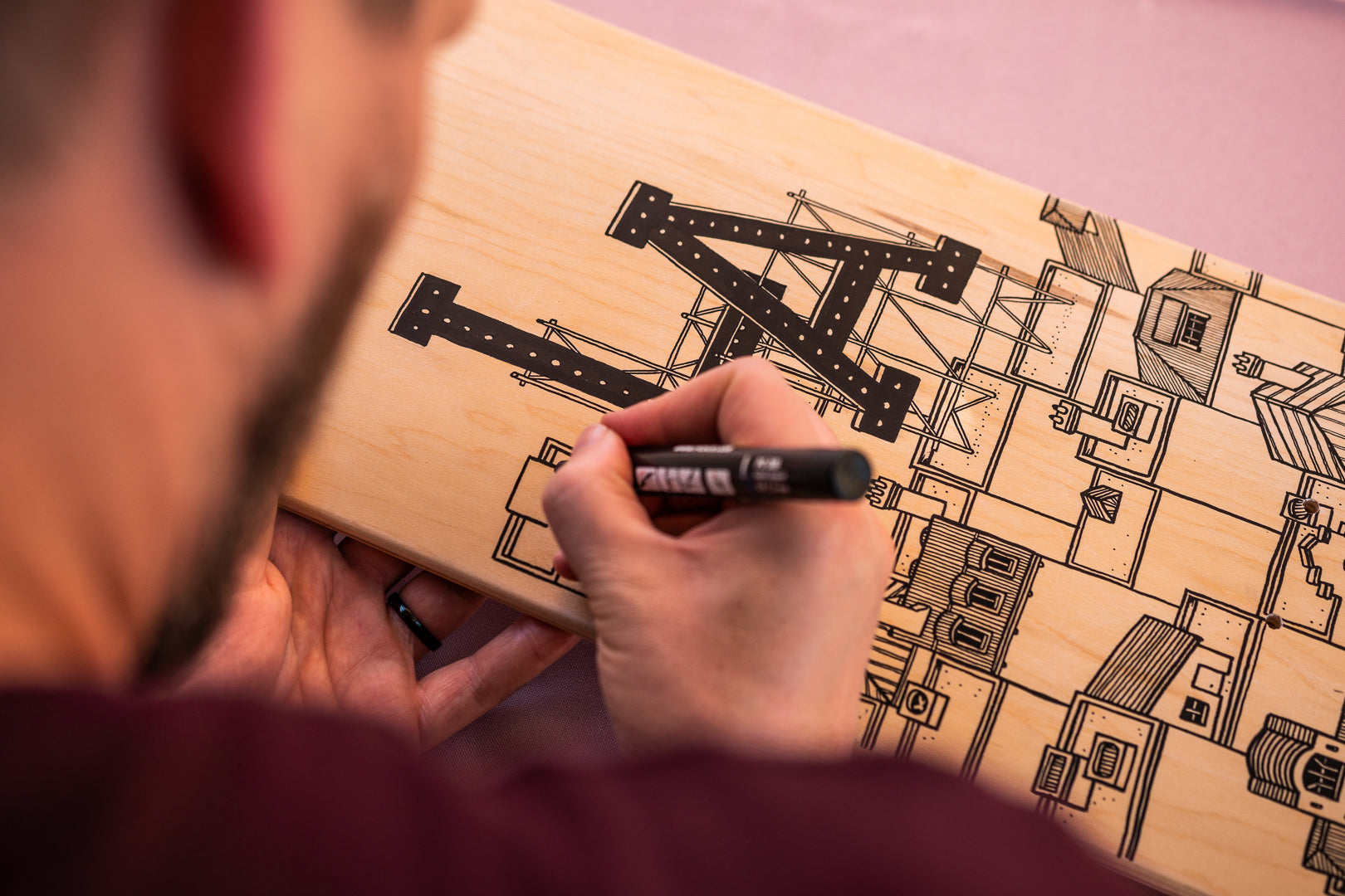 Pour l’occasion, j’ai réalisé une œuvre qui s’étend sur 5 planches de skate : une ville, dessinée au Posca à main levée, me laissant guider par mon imagination bâtiment après bâtiment, inspiré par les différentes architectures que j’ai pu croiser lors de mes voyages.